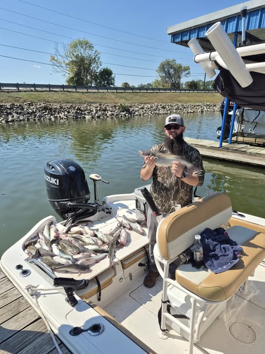 Hybrid striped bass success! Smiling and satisfied