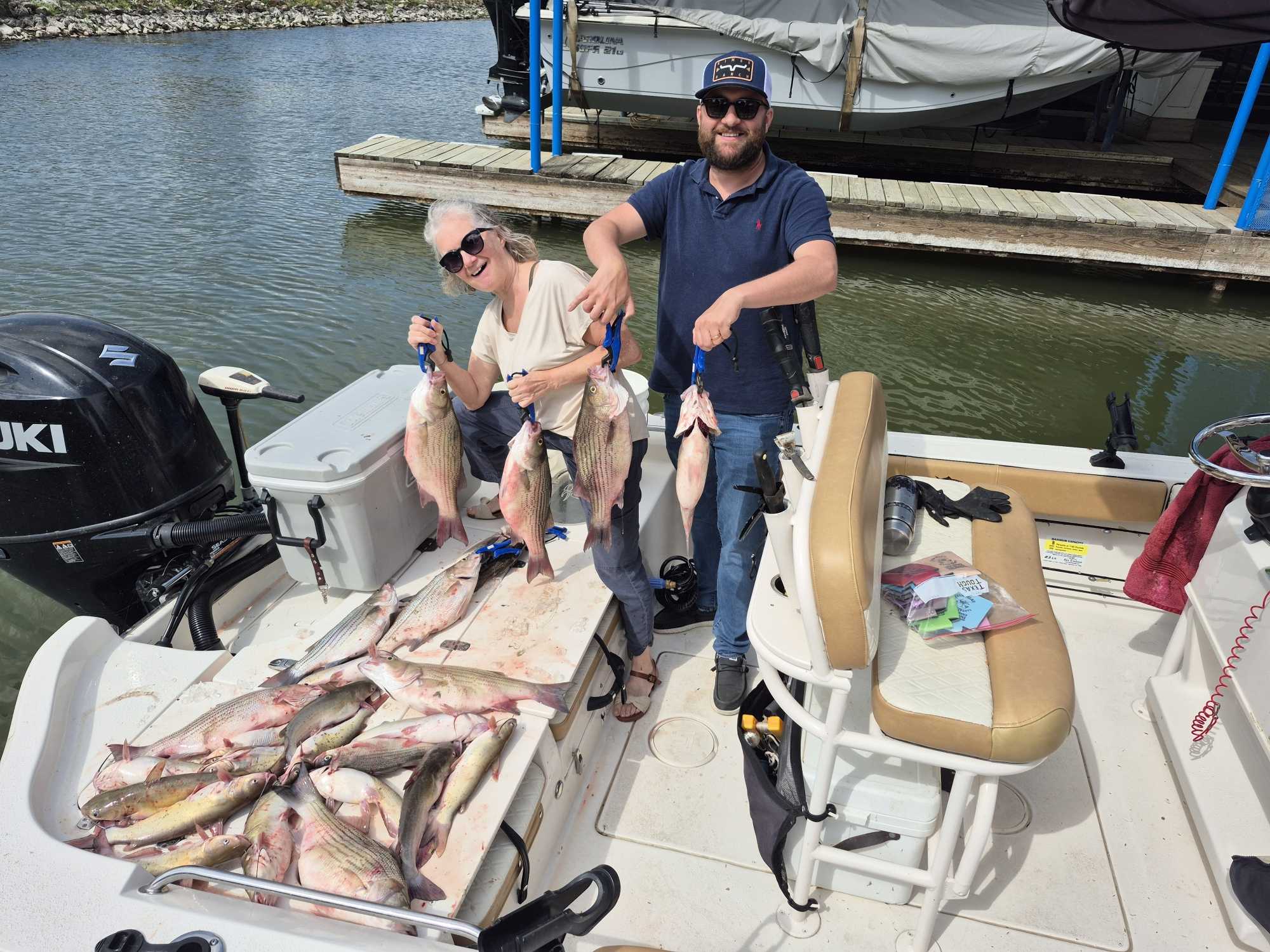 We set out this morning at 6.30 am for some hybrids and they didn't disappoint this mom and son team caught 10 really nice hybrids 1 white bass and 14 good eater size catfish another awesome time fishing with super people Thanks so much for booking with us.